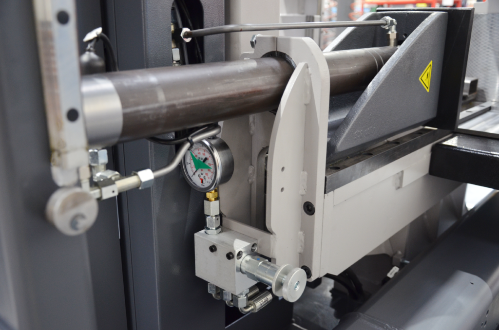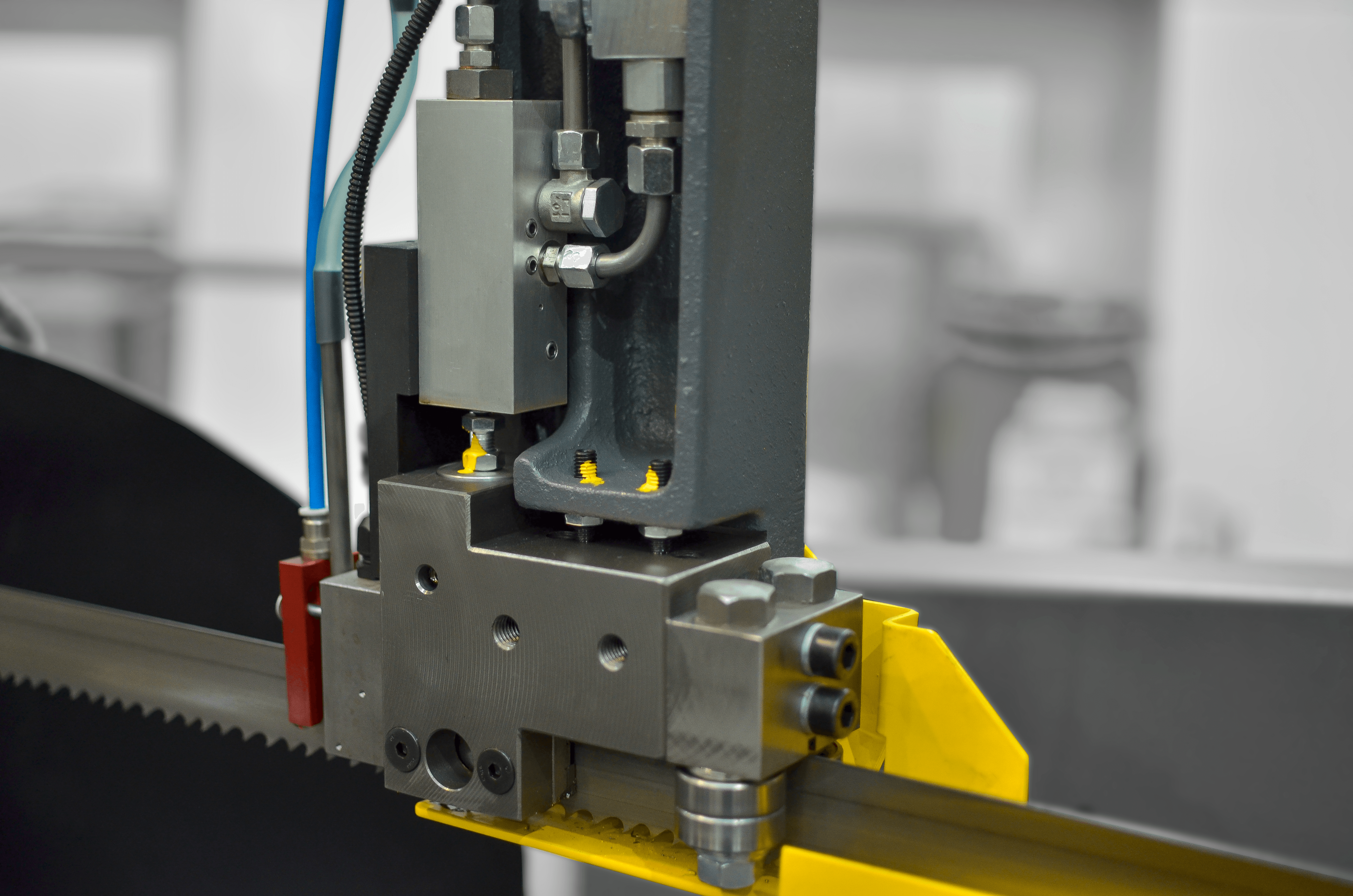 Regulacja ciśnienia w imadłach przecinarek taśmowych umożliwia precyzyjne dostosowanie siły docisku i przesuwu materiału w zależności od jego rodzaju, kształtu i wymiarów. System ten stosowany jest zarówno w imadłach zaciskających (mocujących materiał do cięcia), jak i podających (przesuwających materiał w cyklu automatycznym).