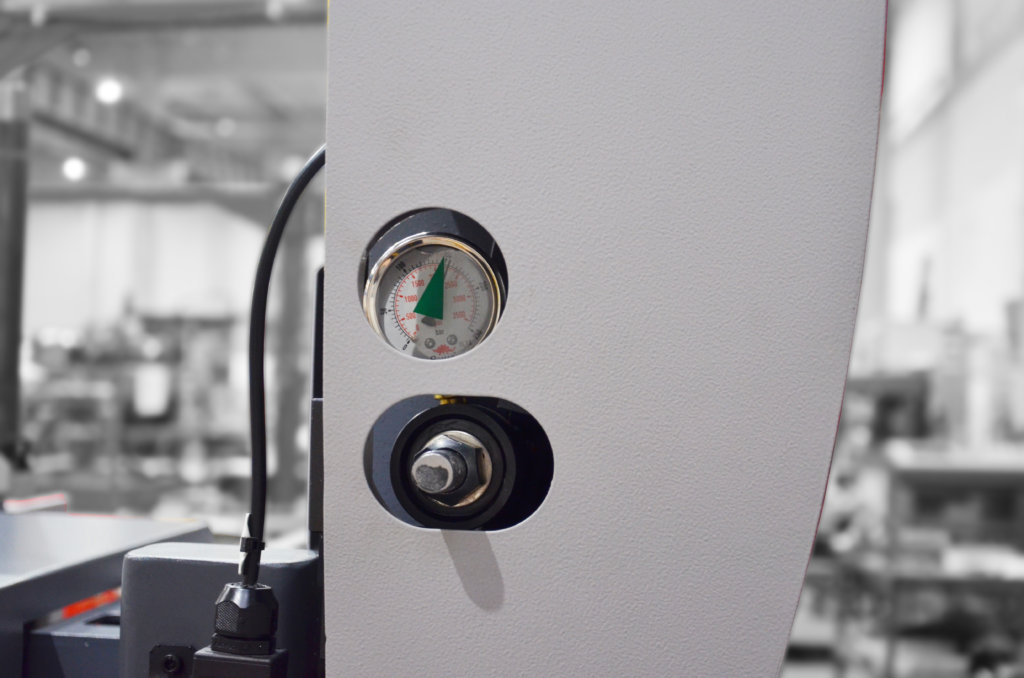 Hydrauliczny wskaźnik napięcia taśmy to precyzyjny element kontrolny stosowany w przecinarkach taśmowych, umożliwiający bieżący odczyt siły napięcia taśmy tnącej. Działa w oparciu o układ napinający taśmę i wskazuje wartość ciśnienia, które odpowiada poziomowi naprężenia. Umożliwia to szybkie i dokładne ustawienie optymalnego napięcia piły bez konieczności pomiarów zewnętrznych.