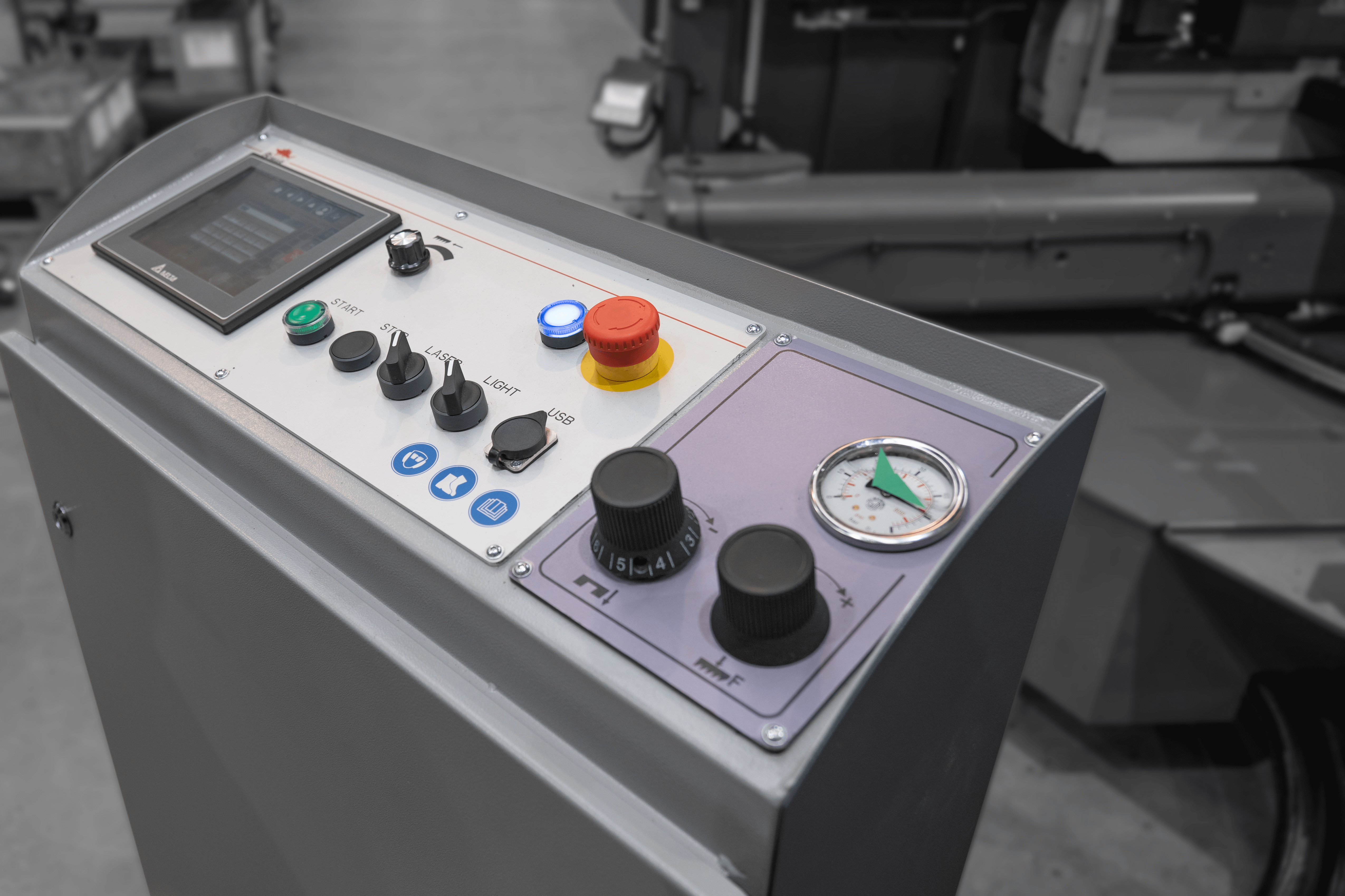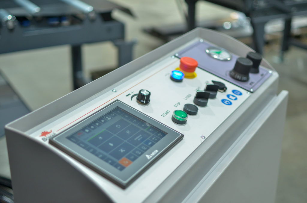 Panel sterowania znajduje się na oddzielnie stojącej szafie sterowniczej co ułatwia pracę operatorowi w dogodnym dla niego miejscu podczas cięcia. Na podświetlanym czterowierszowym wyświetlaczu pokazywana jest prosta kontrola dialogowa z wiadomościami tekstowymi. Maszyna umożliwia programowanie ilości detali, pamięć pozycji ramienia, tryb ręczny do indywidualnej kontroli funkcji.