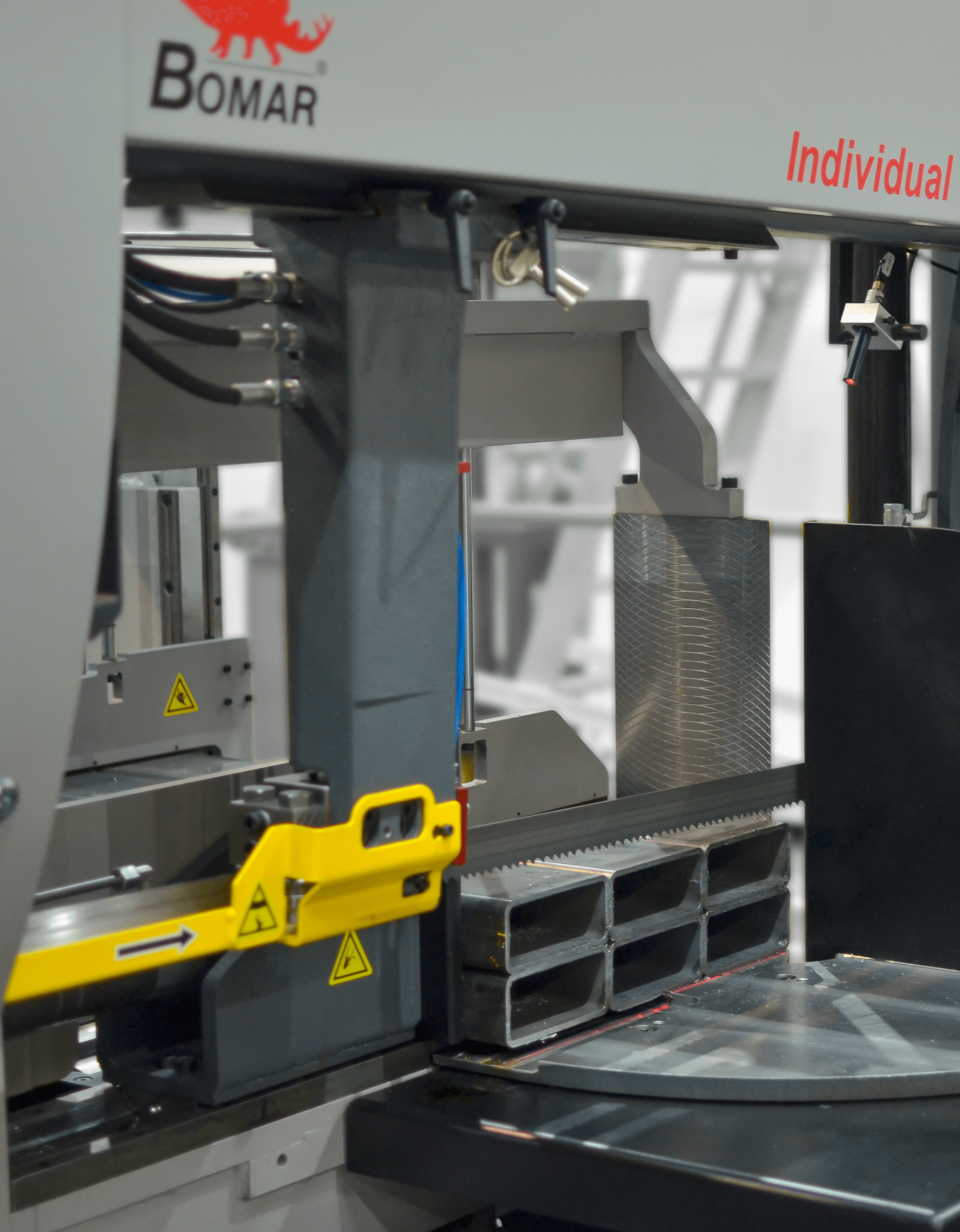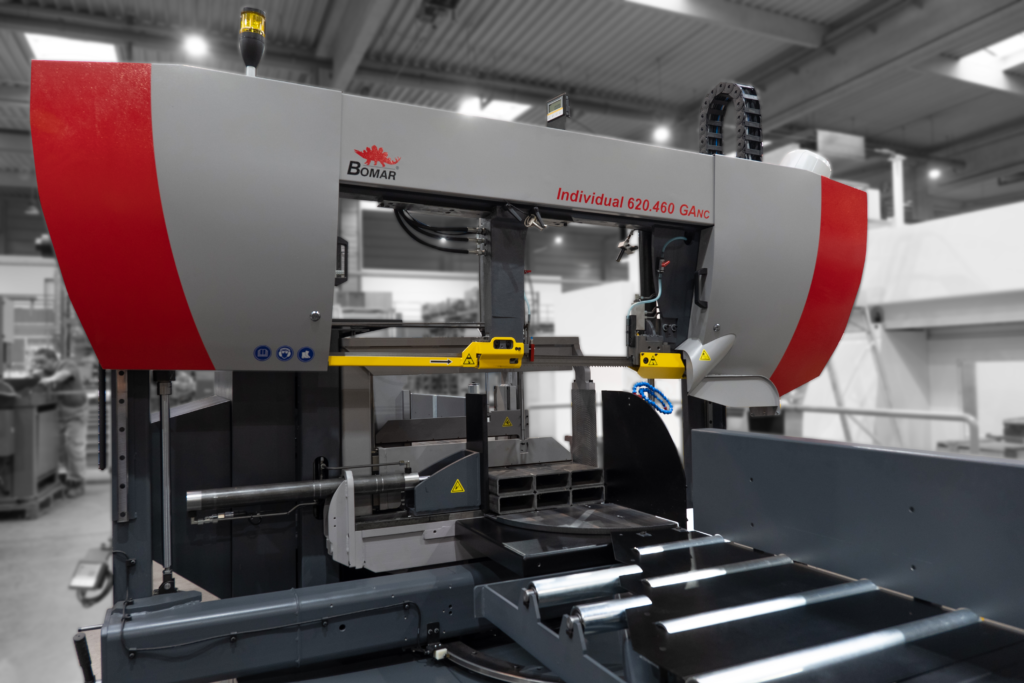 Przecinarka taśmowa Individual 520.360GANC wyposażona jest w dwa imadła. Imadło główne i imadło podające materiał do cięcia. Mocne imadło i solidne szczęki zapewniają stabilny zacisk materiału co przekłada się na dokładność cięcia i bezpieczeństwo operatora. Największą zaletą tej maszyny jest możliwość zaprogramowania różnej ilości sztuk obrabianego materiału, o różnych długościach, bez dalszej kontroli maszyny. Maksymalna długość pojedynczego posuwu to 750 mm. Cały cykl roboczy kończy się po zaprogramowaniu długości i liczby elementów. Maszyna ta szczególnie nadaje się do cięcia profili i materiałów litych o mniejszych przekrojach z dokładnością jednego posuwu 0,2 mm.