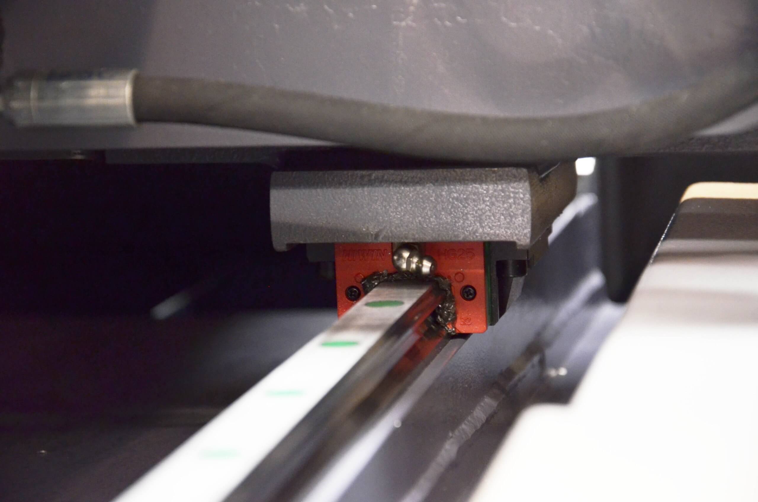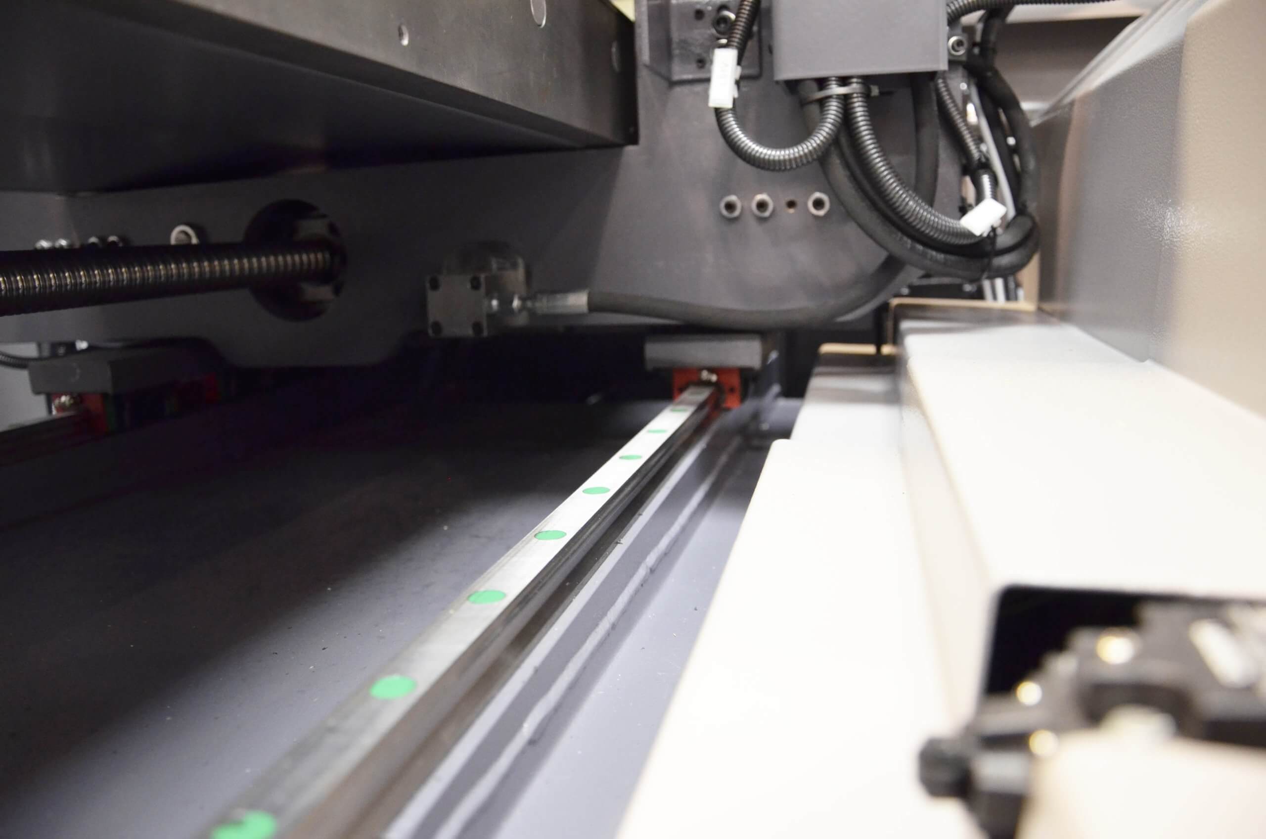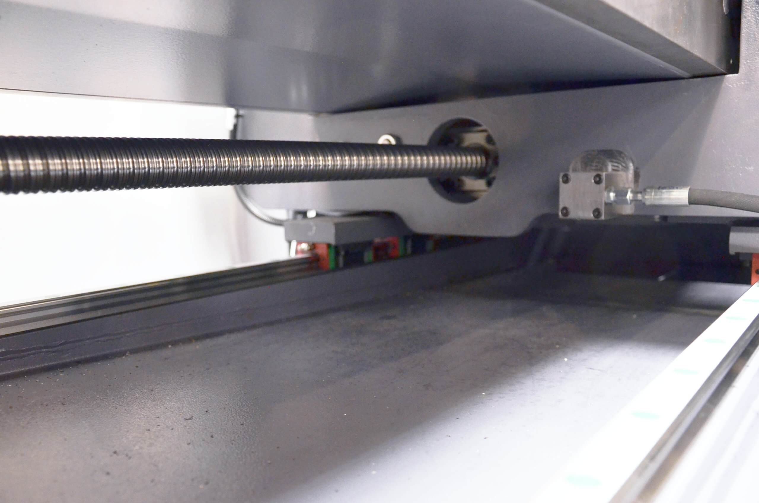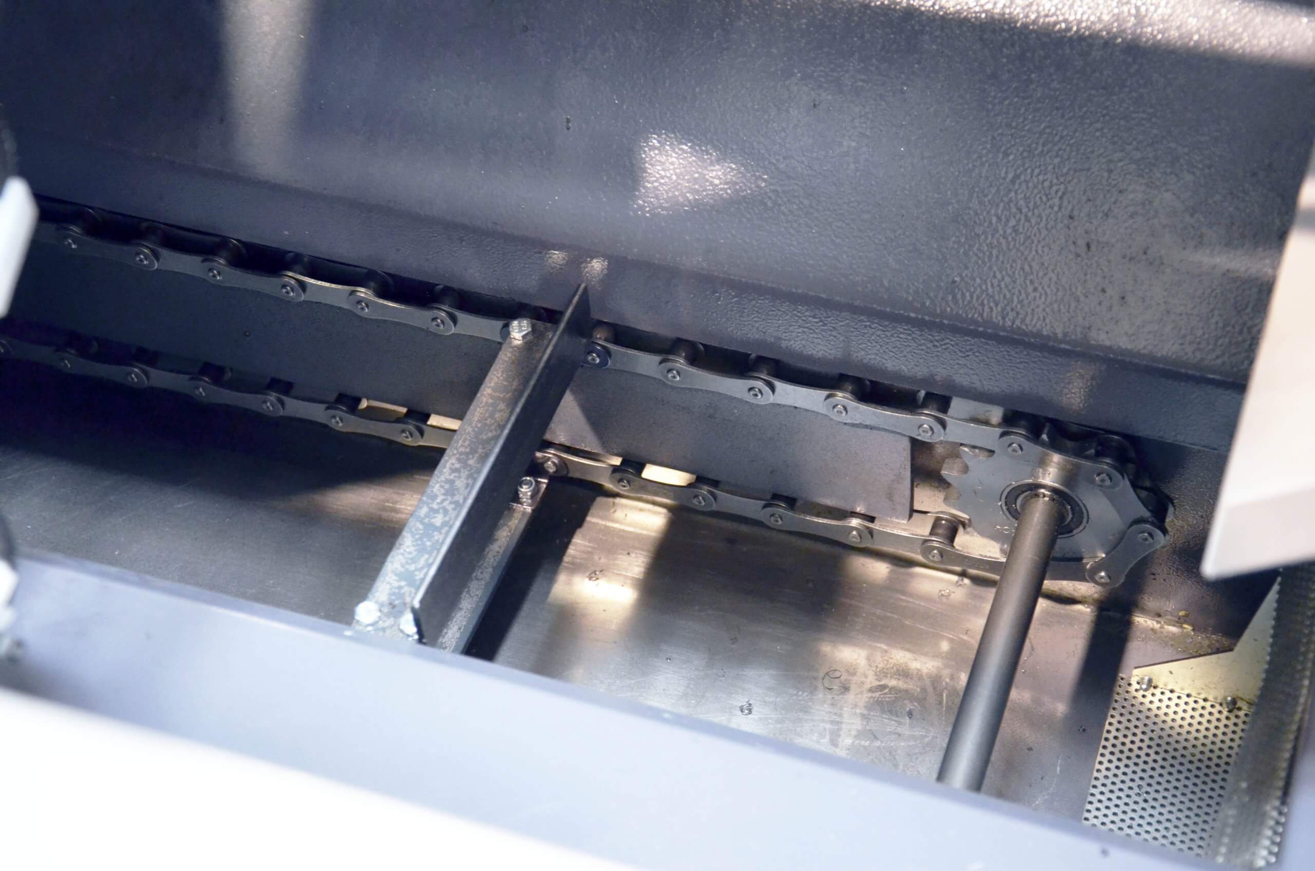 Taśmę napędza silnik przemysłowy sterowany przez falownik w który maszyna jest wyposażona. Dzięki temu prędkość taśmy może być regulowana w sposób płynny od 20-120m/min idealnie dopasowana do ciętego materiału. Napęd wspomagany jest przekładnią ślimakową umieszczoną w kąpieli olejowej.