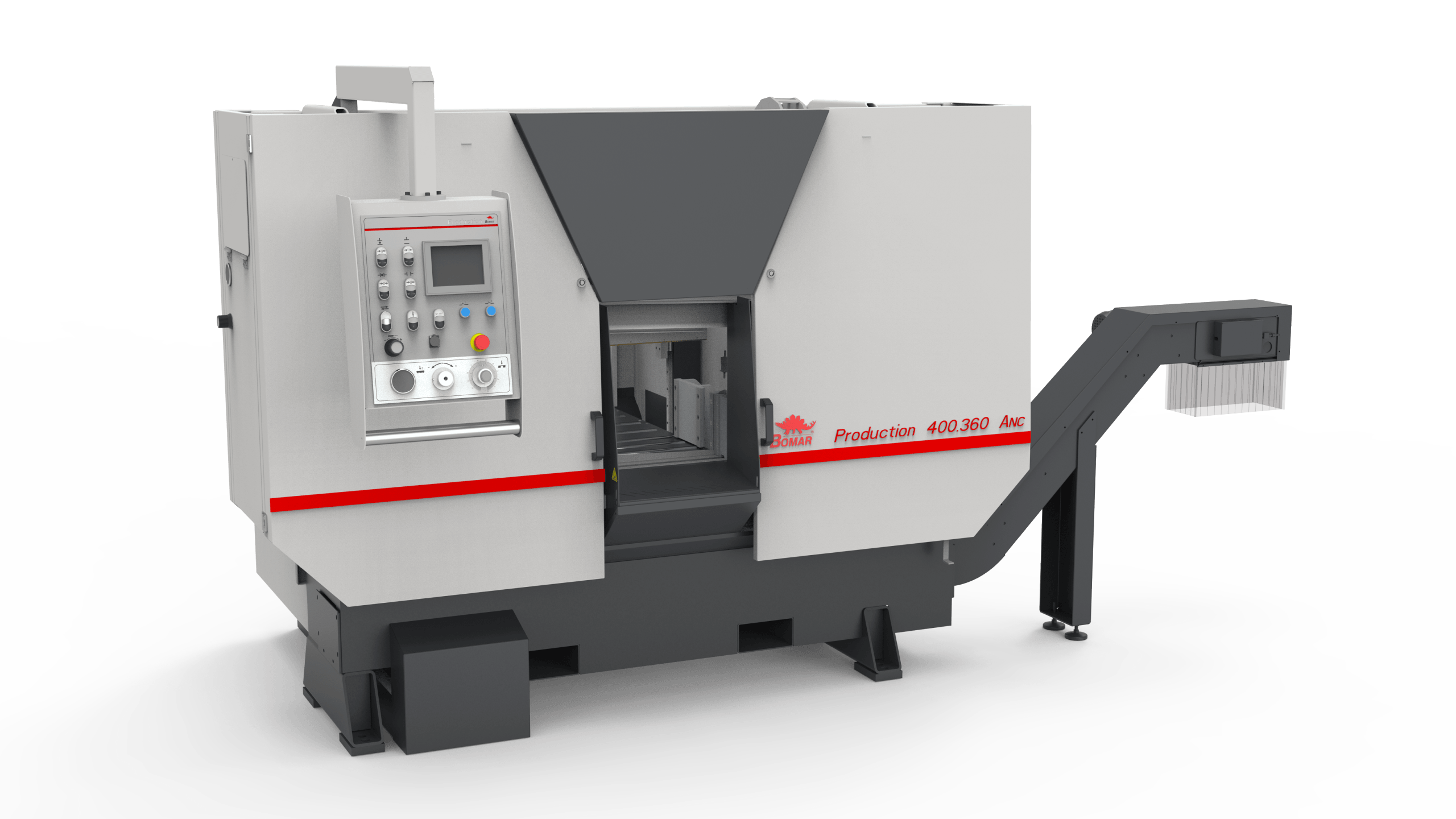 Przecinarka taśmowa Production 400.360ANC wyposażona jest w dwa imadła. Imadło główne i imadło podające materiał do cięcia. Mocne imadło i solidne szczęki zapewniają stabilny zacisk materiału co przekłada się na dokładność cięcia i bezpieczeństwo operatora. Największą zaletą tej maszyny jest możliwość zaprogramowania różnej ilości sztuk obrabianego materiału, o różnych długościach, bez dalszej kontroli maszyny. Materiał jest podawany pod taśmę tnącą za pomocą sterowanego serwonapędu i śruby kulowej. Zaciskanie materiału i posuw ramienia w dół są sterowane hydraulicznie. Maksymalna długość pojedynczego posuwu wynosi 750 mm lub do 6500 mm przy posuwie powtarzalnym. Sekcyjne imadło główne zaciska materiał przed i za taśmą tnącą. Maszyna ta szczególnie nadaje się do cięcia profili i materiałów litych o mniejszych przekrojach z dokładnością jednego posuwu 0,2 mm.