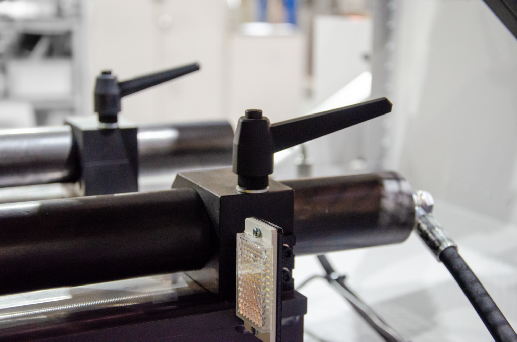 Taśmę napędza silnik przemysłowy sterowany przez falownik w który maszyna jest wyposażona. Dzięki temu prędkość taśmy może być regulowana w sposób płynny od 20-120m/min idealnie dopasowana do ciętego materiału. Napęd wspomagany jest przekładnią ślimakową umieszczoną w kąpieli olejowej.