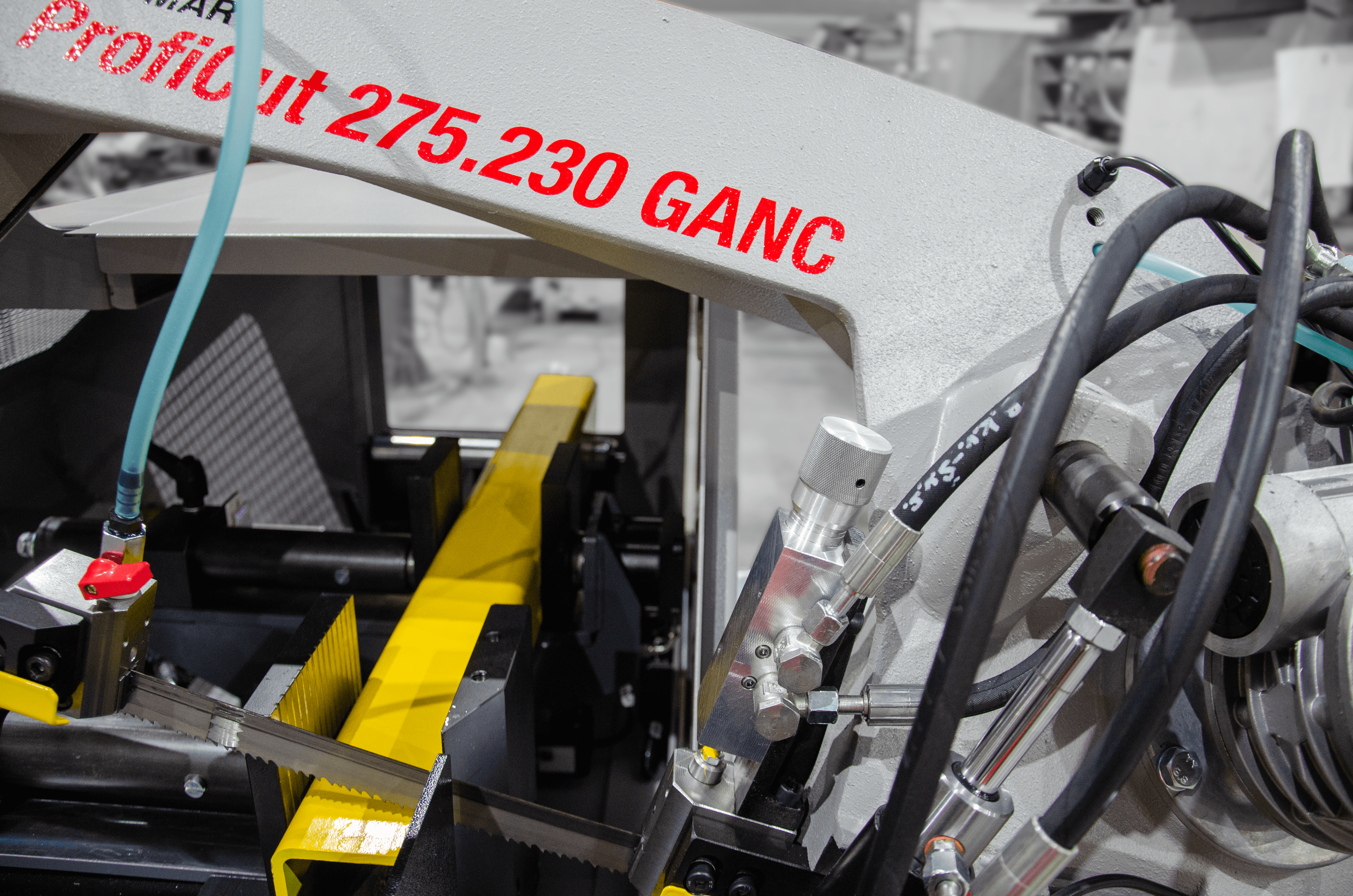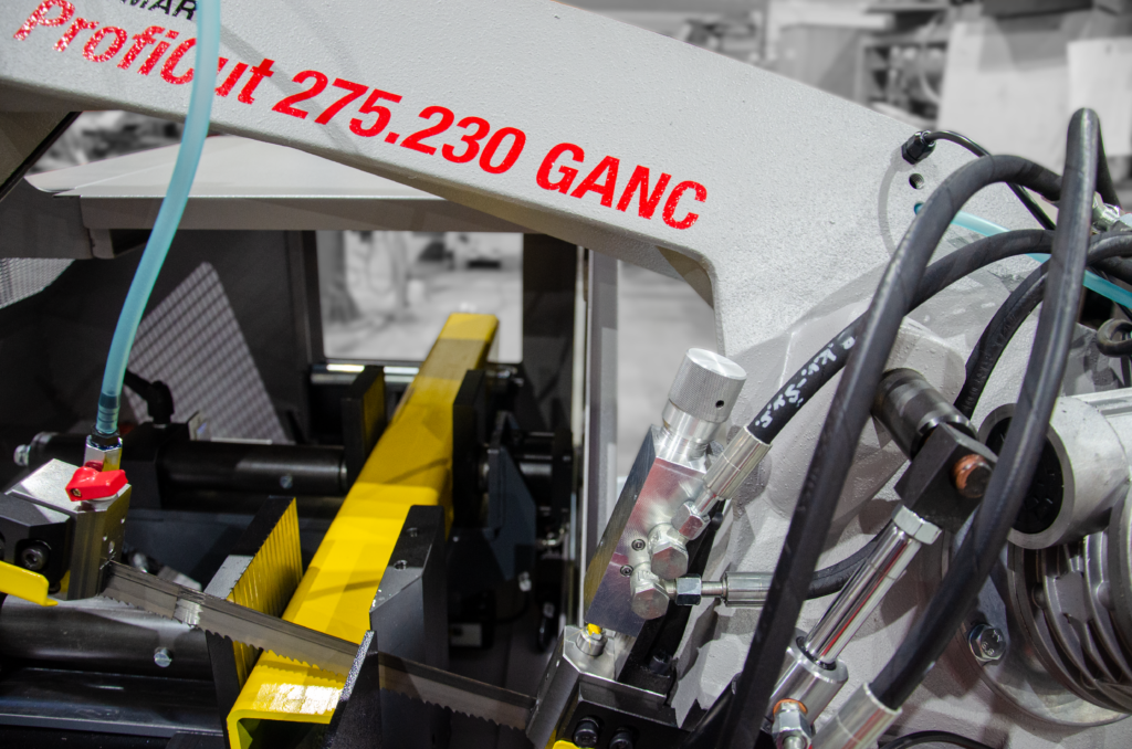 Przecinarka taśmowa Proficut 275.230GANC wyposażona jest w dwa imadła. Imadło główne i imadło podające materiał do cięcia. Mocne imadło i solidne szczęki zapewniają stabilny zacisk materiału co przekłada się na dokładność cięcia i bezpieczeństwo operatora. Największą zaletą tej maszyny jest możliwość zaprogramowania różnej ilości sztuk obrabianego materiału, o różnych długościach, bez dalszej kontroli maszyny. Maksymalna długość pojedynczego posuwu to 500 mm. Maszyna ta szczególnie nadaje się do cięcia profili i materiałów litych o mniejszych przekrojach z dokładnością jednego posuwu 0,2 mm.