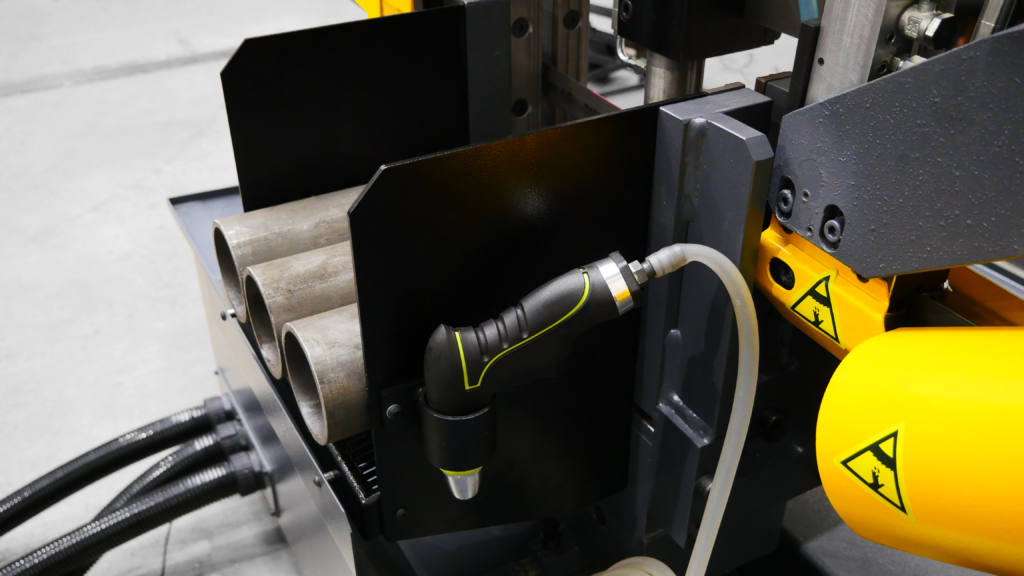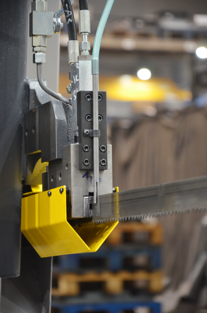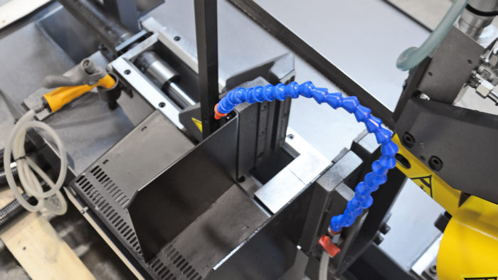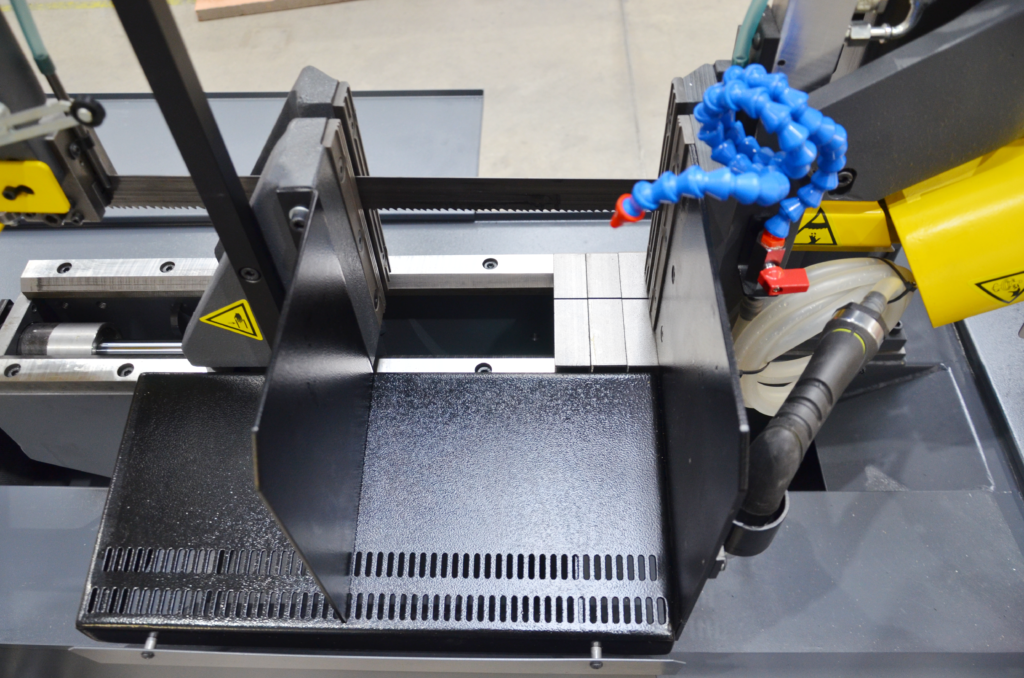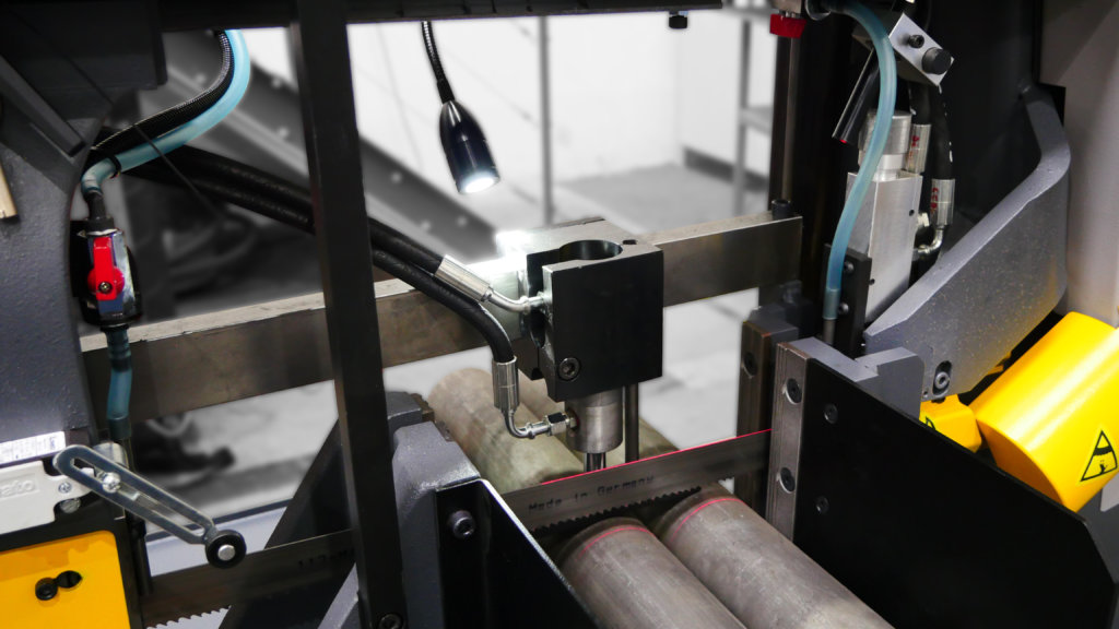 Dodatkowy układ chłodzenia doskonale sprawdzi się przy cięciu materiałów o dużej średnicy, w przypadku, kiedy rozstaw kostek prowadzących jest za szeroki. Ustawienie rozprowadzania płynu chłodzącego jest niezwykle proste. Dodatkowym plusem jest możliwość regulacji. Piła taśmowa jest nie tylko smarowana, ale również chłodzona.
