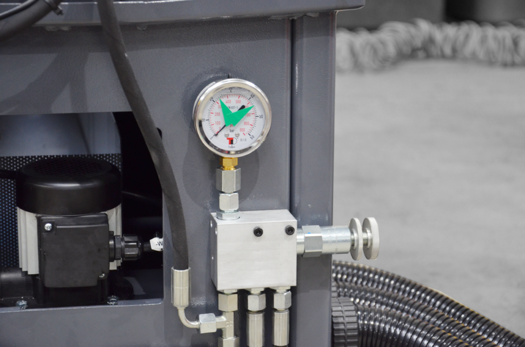 Hydrauliczny wskaźnik napięcia taśmy to precyzyjny element kontrolny stosowany w przecinarkach taśmowych, umożliwiający bieżący odczyt siły napięcia taśmy tnącej. Działa w oparciu o układ napinający taśmę i wskazuje wartość ciśnienia, które odpowiada poziomowi naprężenia. Umożliwia to szybkie i dokładne ustawienie optymalnego napięcia piły bez konieczności pomiarów zewnętrznych.