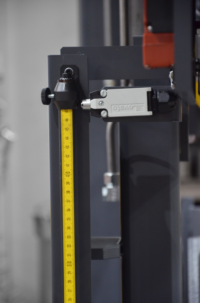 Dzięki dwukolumnowej budowie przecinarka taśmowa Proline 420.350H posiada bardzo stabilne ramię a taśma jest pochylona względem powierzchni imadła pod kątem 2°, co przyczynia się do dłuższej żywotności taśmy. Aby osiągnąć krótsze czasy cięcia maszyna w wyposażeniu standardowym posiada regulację wysokości na jaką ma podnieść się ramie po ucięciu materiału – zdjęcie po lewej.