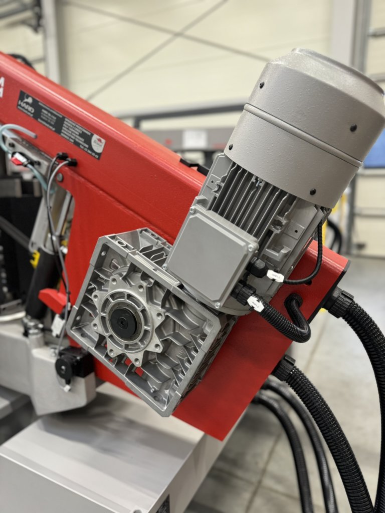 Taśmę napędza silnik przemysłowy sterowany przez falownik w który maszyna jest wyposażona. Dzięki temu prędkość taśmy może być regulowana w sposób płynny od 20-120m/min idealnie dopasowana do ciętego materiału. Napęd wspomagany jest przekładnią ślimakową umieszczoną w kąpieli olejowej.