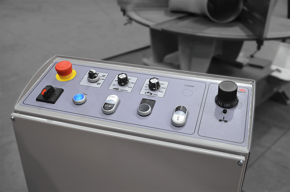 Panel sterowania znajduje się na ruchomym uchwycie co ułatwia pracę operatorowi w dogodnym dla niego miejscu podczas cięcia. Na podświetlanym czterowierszowym wyświetlaczu pokazywana jest prosta kontrola dialogowa z wiadomościami tekstowymi.