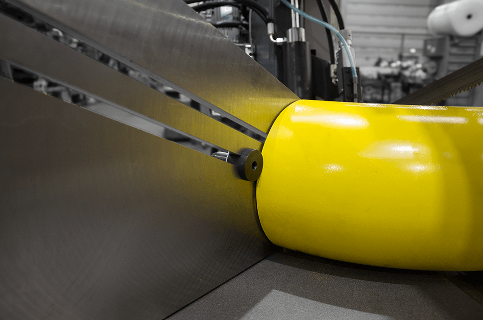 Taśmę napędza silnik przemysłowy sterowany przez falownik w który maszyna jest wyposażona. Dzięki temu prędkość taśmy przecinarki może być regulowana w sposób płynny od 20-120m/min idealnie dopasowana do ciętego materiału. Napęd wspomagany jest przekładnią ślimakową umieszczoną w kąpieli olejowej.