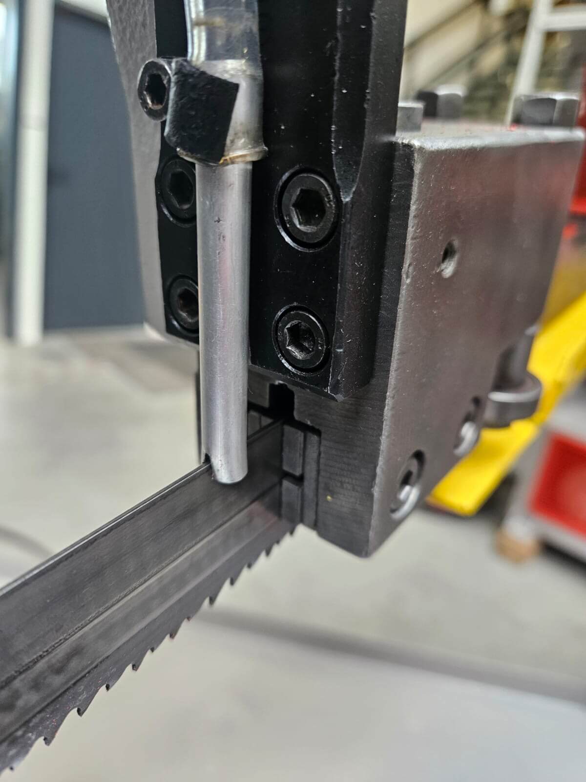 Po włożeniu materiału i naciśnięciu przycisku START, materiał zostaje zaciśnięty za pomocą imadła hydraulicznego o pełnym skoku i rozpoczyna się praca taśmy piły. Za pomocą zaworu nadmiarowego operator wybiera optymalną prędkość taśmy oraz prędkość posuwu ramienia.
