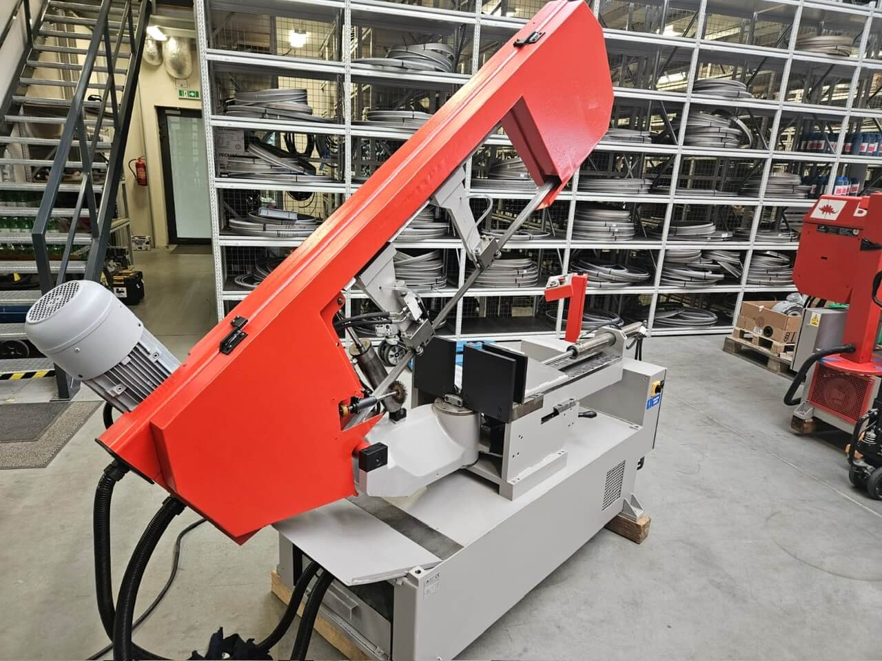 W wersji standardowej maszyna wyposażona jest w następujące urządzenia dodatkowe: cyfrowy wskaźnik obrotu ramienia, wyświetlacz prędkości taśmy zmienianej przez przemiennik częstotliwości, zapamiętane zaprogramowane pozycje ramienia i imadła po cięciu oraz automatyczna zmiana prędkości opuszczania ramienia w zależności od kształtu materiału.
